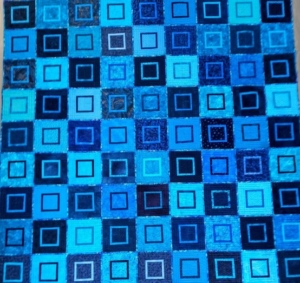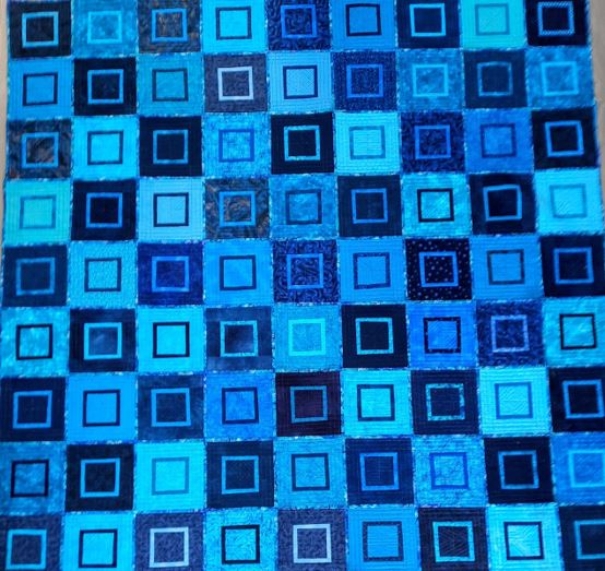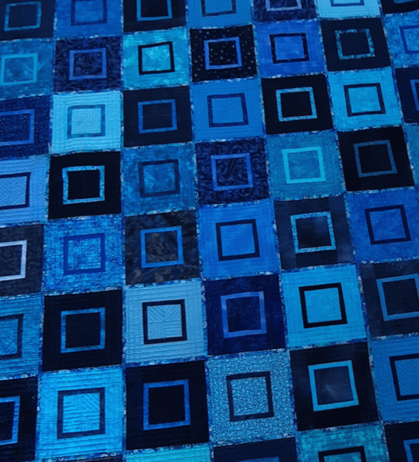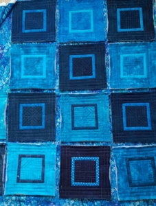 Ik vond het zo leuk geworden dat ik dit patroon en werkwijze ook voor Jordy zijn quilt heb gebruikt (81 blokjes en 2.00 x 2.00 m). Heb allemaal katoenen blauwe stofjes gezocht en maar blokjes naaien. Achterkantje en fiberfill er tussen en dan met de hand quilten.