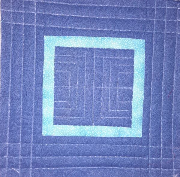 De blokjes heb ik met de machine gemaakt en met de hand gequilt, daarna als quilt-as-you-go aan elkaar gezet.