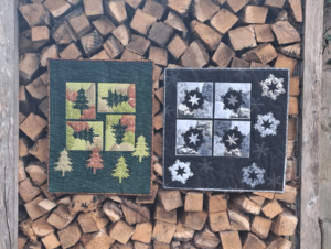Yvonne Schut maakte deze twee mini kerstquiltjes volgens de “Four in the raw” methode van Helen Godden.