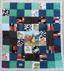 Elly de Leeuw den Bouter heeft na het plotselinge overlijden van haar zus een quilt gemaakt voor de kleindochter van haar zus. De quilt is gemaakt van haar kleding en de kleindochter heeft geholpen. De achternaam van haar zus was Den Haan, vandaar in het midden een blok met een haan, een hen en drie kuikens. De kleindochter mist haar oma en is blij met deze herinneringsquilt op haar bed.