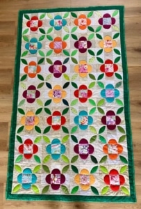 Het patroon van de flower power quilt in Quiltnieuws 157 sprak haar erg aan, vooral omdat ze deze quilt ook met de hand kon maken. Ze heeft er veel uren met plezier in de tuin aan gewerkt.