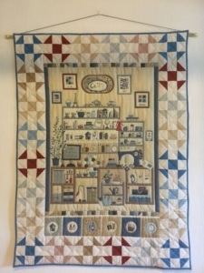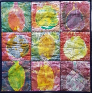 Tiny Koppens maakte de quilt ‘In kannen en kruiken’ (50×50 cm). Geverfd met de gelliplate en daarna met de hand geborduurd. De rest is met de naaimachine in elkaar gezet en afgewerkt.