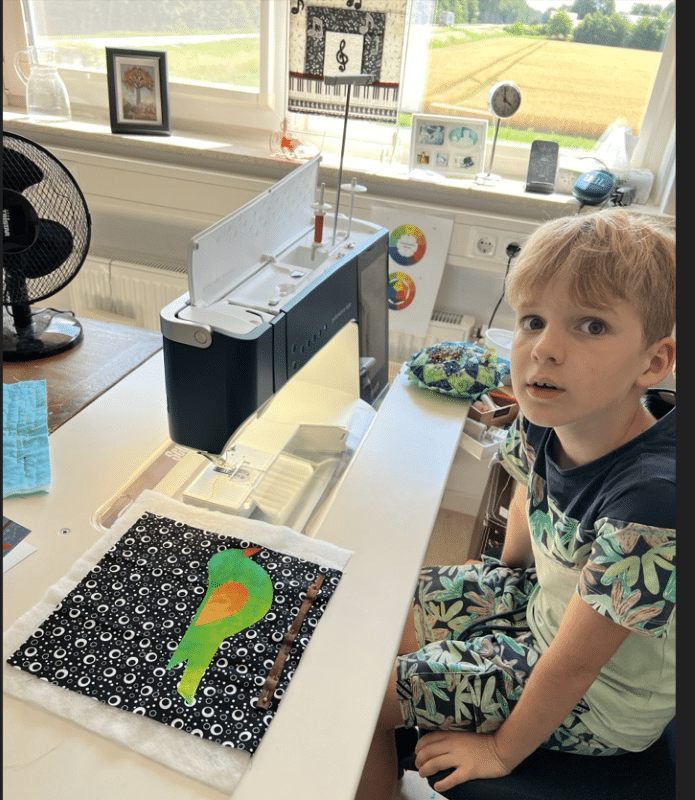 Kleinzoon Joshua (8 jaar) van Jannie de Breuk vindt naaien met de naaimachine helemaal geweldig. In Quiltnieuws 162 stond een leuk vogeltje om de appliqueren. Joshua heeft de stofjes uitgezocht en oma heeft alles op vliesofix getekend. Heel rustig en netjes heeft Joshua het vogeltje op de achtergrondstof genaaid. Het is een leuk schilderijtje geworden.