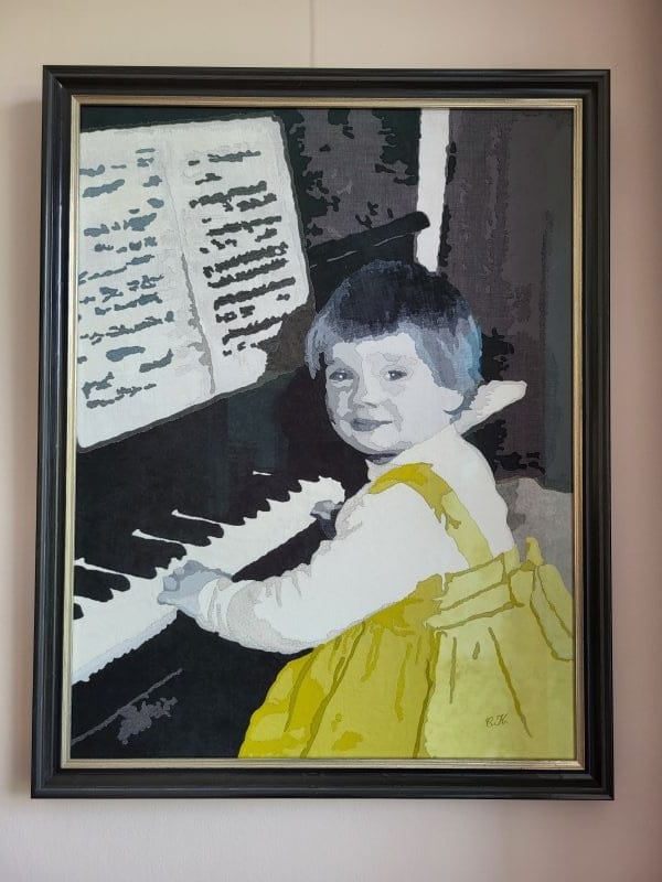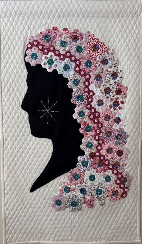 Connie Kaal quilt sinds begin 2023. In Rijswijk werd zij geïnspireerd door portretten van stof. Ze nam een oude foto van zichzelf en bewerkte deze op de computer. Vervolgens werd met vliesofix de onderdelen van de foto op de stof vastgemaakt. Tenslotte alles vastgenaaid met een heel klein zigzag steekje. De top is daarna ingelijst.