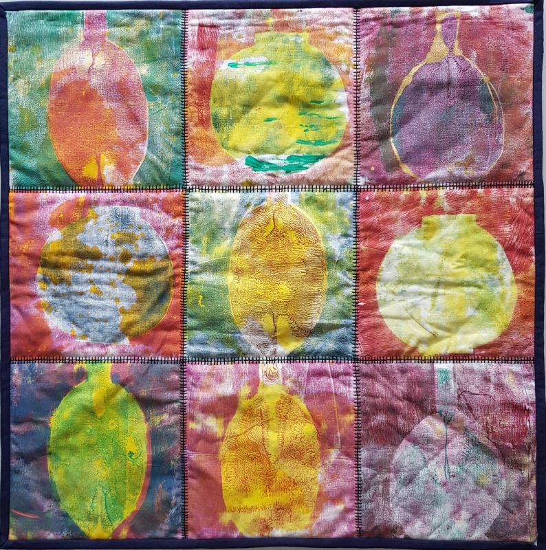 Tiny Koppens maakte de quilt ‘In kannen en kruiken’ (50×50 cm). Geverfd met de gelliplate en daarna met de hand geborduurd. De rest is met de naaimachine in elkaar gezet en afgewerkt.