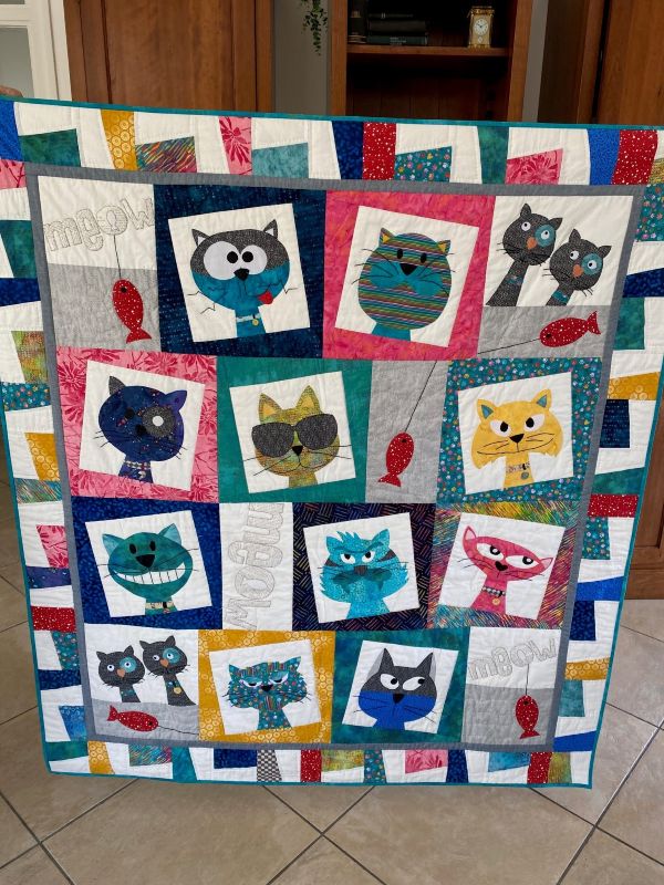Annet Koot maakte een quilt van Kattenkoppen. Het patroon is van Claire Turpin design. Het is een kleurrijk patroon waarbij je heel veel stofjes uit je voorraad kunt gebruiken.
