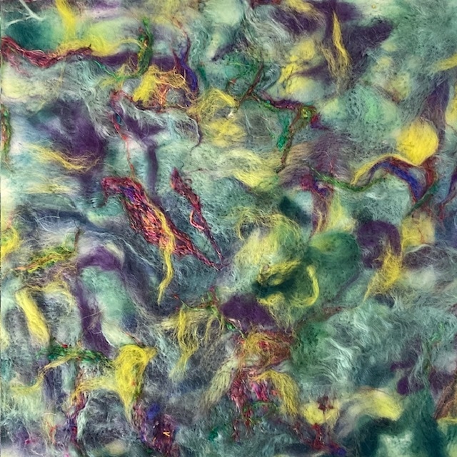 Het uitleggen is een heerlijk proces. Iedere keer een stukje “plukken” van de wol en op ondergrond laten dwarrelen. Speels, alles door elkaar en niet te strak.