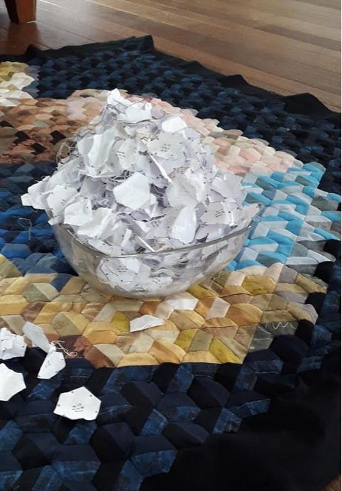 Om zeshoekjes te kunnen maken met de English paper piece methode heb ik steeds 2 stroken in de lengte aan elkaar genaaid en de zeshoekjes daar op gelegd en uitgeknipt.