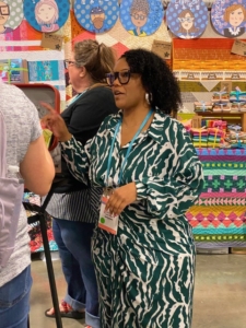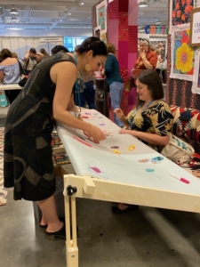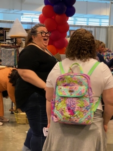 Dus ging ik even langs om persoonlijk dank-je-wel te zeggen! Ik werd direct in de armen gesloten in een hele grote dikke ‘hug’ (dat mocht van mij, want ik had een sticker op mijn toegangskaart, die zei dat ik dat wel wilde) door de vrolijkste en meest luidruchtige quiltwinkel eigenaar van de show en waarschijnlijk van de hele wereld, Heather Givans. Ik kreeg ook meteen een sticker met ‘Bestie’ op geplakt. Zo leuk! De hele sfeer tijdens de show was vrolijk, opgewekt, ontspannen. Ongelooflijk. En ik was niet de enige die dit opmerkte.