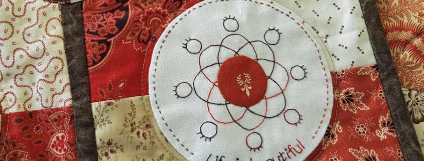 Maar ja, ik heb het hartstikke druk met werk en met quilten was ik nu juist zo goed bezig met wat (lang-)lopende projecten afmaken. Dus vooral nu niet iets nieuws starten. En de twee projecten bovenop mijn stapel passen perfect bij deze rare tijden. Zo is de Life is Beautiful (Helen Stubbings) inmiddels een complete AFFO, met label en tunnel zodat ik ‘m straks op kan hangen (klik op de foto om een grotere afbeelding te zien).