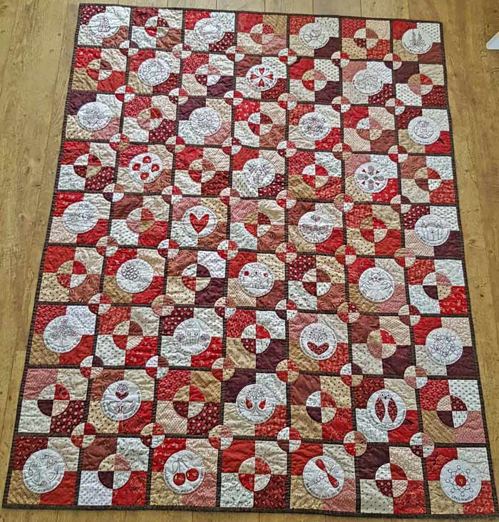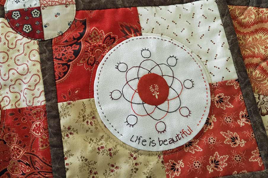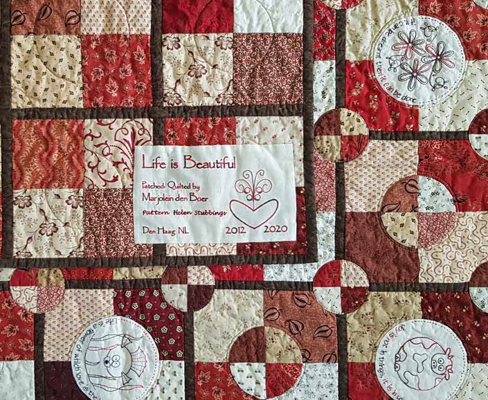 Maar ja, ik heb het hartstikke druk met werk en met quilten was ik nu juist zo goed bezig met wat (lang-)lopende projecten afmaken. Dus vooral nu niet iets nieuws starten. En de twee projecten bovenop mijn stapel passen perfect bij deze rare tijden. Zo is de Life is Beautiful (Helen Stubbings) inmiddels een complete AFFO, met label en tunnel zodat ik ‘m straks op kan hangen (klik op de foto om een grotere afbeelding te zien).