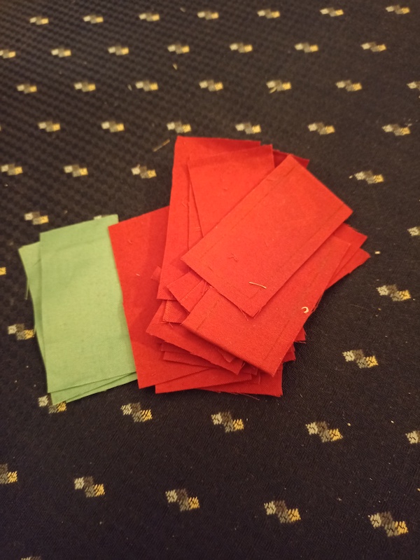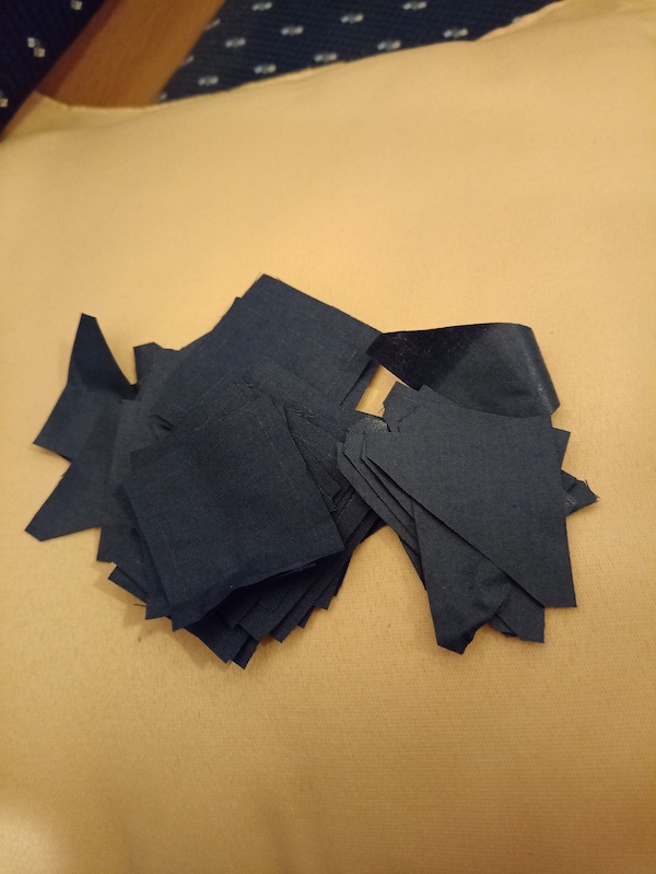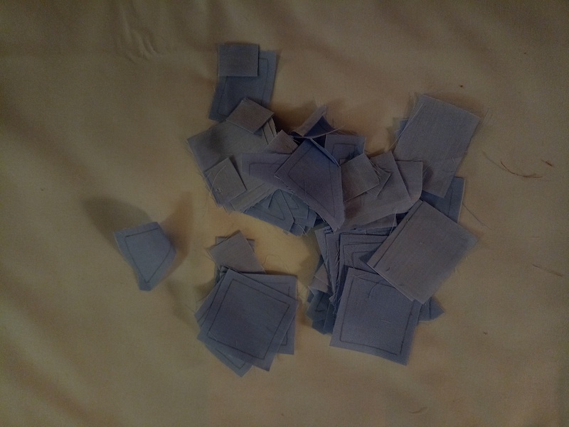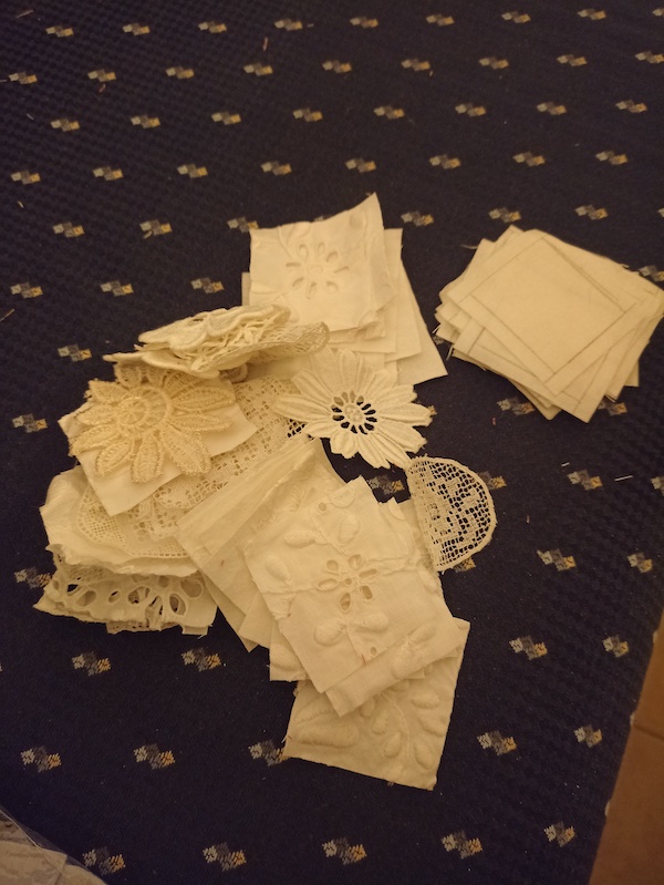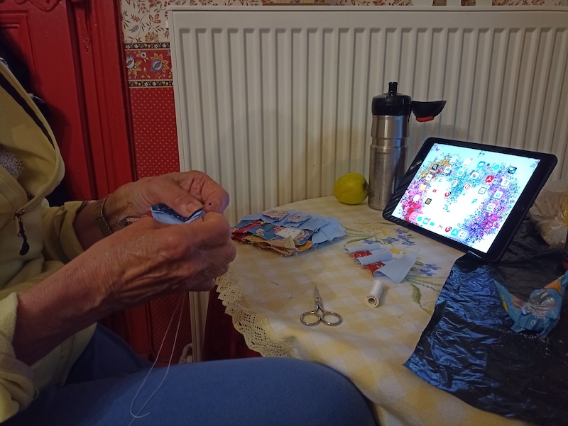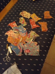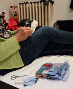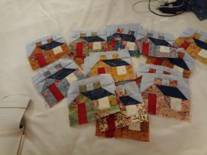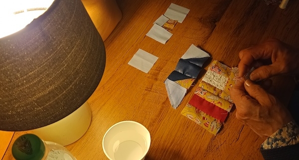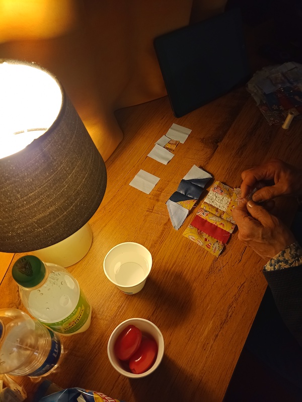 Vlak voor ons vertrek was ik gestart met een huisjesquilt van stofjes die ik in het najaar op de Regiodag had gekocht, gecombineerd met een oud blauw overhemd van manlief voor de luchten. Een huis bestaat uit 20 stukjes en voor elk raam had ik stukjes handwerk van mijn (overleden) moeder bedacht. Natuurlijk wilde ik daar in de vakantie mee doorgaan maar om naast de stofjes nou ook snijmat, mallen, rolmes, potlood, lineaal, enz. mee te moeten nemen, paste niet binnen mijn 300 gram… Quilten blijkt dan toch het lekkerste thuis omdat je alles bij de hand hebt!