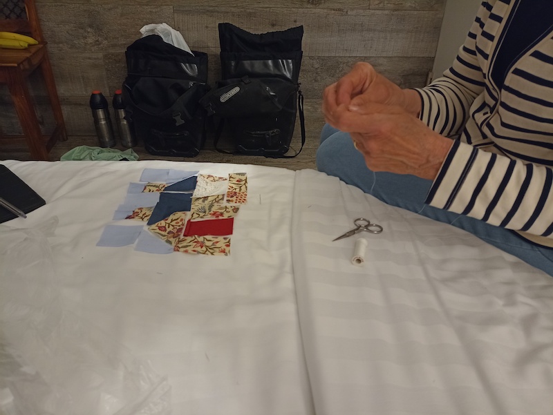 Alles wat je meeneemt, moet in 4 fietstassen gepropt worden die dan ook nog niet teveel mogen wegen omdat elk kilootje mee de bergen in en over moet. Naast de noodzakelijke spullen mag ik van mezelf dan 300 gram aan quiltspullen meenemen (voor mij ook heel noodzakelijk!!).