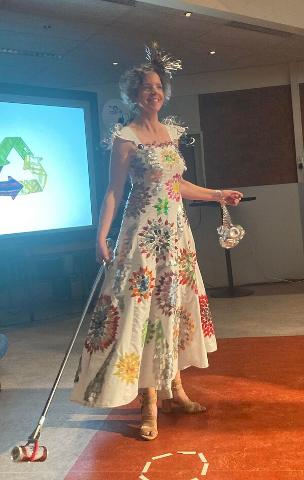 3e plaats : Anja Hillman, met een outfit gemaakt van een oud laken van haar schoonfamilie met verwerking van gevonden blikjes.