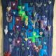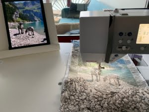De weken gingen voorbij, de bergfoto op mijn prikbord deed me wel verlangen naar de zomer, coronavrij op vakantie. Zo zal zij ook wel naar mijn vlinder gekeken hebben midden in de winterkou! Ik vond het wel eng om te beginnen, de foto is vrij gedetailleerd en abstract werken zit niet zo in mijn hoofd. Maar om het realistisch te maken was weer niet zo eenvoudig… Uiteindelijk heb ik de foto op stof geprint en dat als basis gebruikt om op te werken. Met kant en stiksels kwam er steeds meer leven in de platte foto. Dat is wel een les die ik geleerd heb, zorg dat je wat toevoegt anders had je de foto net zo goed uitgeprint aan de muur kunnen hangen.
