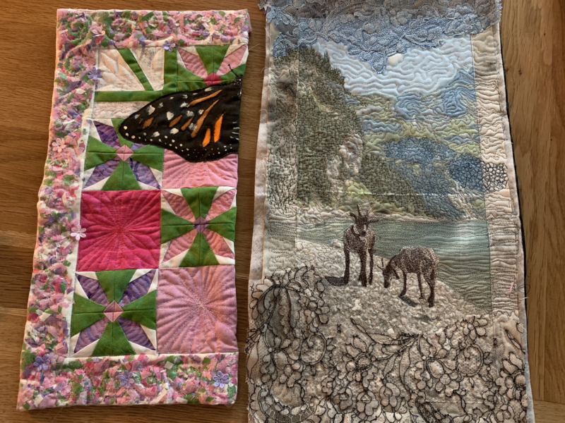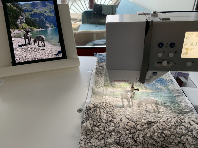 De weken gingen voorbij, de bergfoto op mijn prikbord deed me wel verlangen naar de zomer, coronavrij op vakantie. Zo zal zij ook wel naar mijn vlinder gekeken hebben midden in de winterkou! Ik vond het wel eng om te beginnen, de foto is vrij gedetailleerd en abstract werken zit niet zo in mijn hoofd. Maar om het realistisch te maken was weer niet zo eenvoudig… Uiteindelijk heb ik de foto op stof geprint en dat als basis gebruikt om op te werken. Met kant en stiksels kwam er steeds meer leven in de platte foto. Dat is wel een les die ik geleerd heb, zorg dat je wat toevoegt anders had je de foto net zo goed uitgeprint aan de muur kunnen hangen.