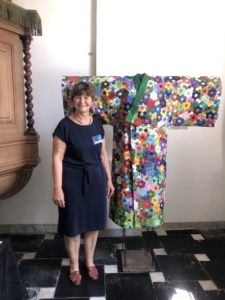 Als eerste kwamen we op zaterdag langs het kerkje van Jo. Wat een prachtig geheel haar jute zakken als ‘jaarkalender’. Voor elke maand een andere vorm, kleur en detail. Van Jo hebben we een ledenportret gemaakt waarin ze uitlegt hoe belangrijk het lidmaatschap van het Quiltersgilde voor haar is. Op ons YouTube kanaal is haar portret te zien. Op de terugweg naar de camping op zondag ben ik ook nog even bij Elfriede binnengelopen. Ik vind haar echt een goed voorbeeld van een moderne quilter. Zij is als vrijwilliger bij het Quiltersgilde een keer in de schijnwerpers gezet. Lees het verhaal hier en daar zie je ook meer van haar werk.