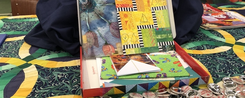 Op vrijdag stond ik namelijk in de hal met de ‘onuitspreekbare naam’ bezoekers te wijzen op de voordelen van het lidmaatschap van het Quiltersgilde. Er lagen oude Quiltnieuwsen die meegenomen mochten worden. Alle flyers over onze komende Algemene Tentoonstelling, modern- en art quilten en de voordelen van het lid worden werden gretig in de tas gestopt. Leuke gesprekken gevoerd en heel veel bekenden gesproken.