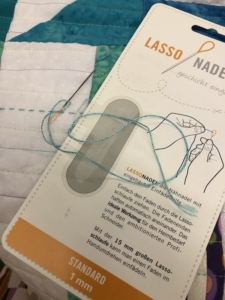 Een kopje koffie met appeltaart gehaald. En daarnaast moet je ook wat met je handen doen vind ik. Dus werkte ik aan mijn Moderne Round Robin die op de Algemene Tentoonstelling komt te hangen. Ik heb nieuwe naalden met een ‘lasso’. Die werken perfect voor big stitch met dikker garen. De naalden komen uit Duitsland. Kijk maar eens op de website www.lassonadel.de