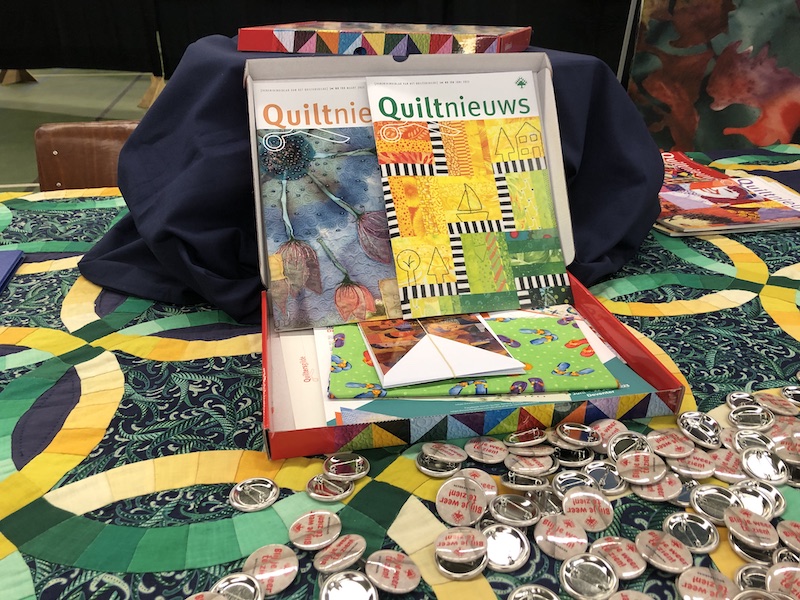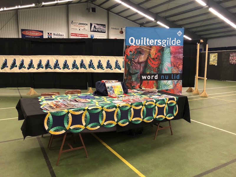 Op vrijdag stond ik namelijk in de hal met de ‘onuitspreekbare naam’ bezoekers te wijzen op de voordelen van het lidmaatschap van het Quiltersgilde. Er lagen oude Quiltnieuwsen die meegenomen mochten worden. Alle flyers over onze komende Algemene Tentoonstelling, modern- en art quilten en de voordelen van het lid worden werden gretig in de tas gestopt. Leuke gesprekken gevoerd en heel veel bekenden gesproken.