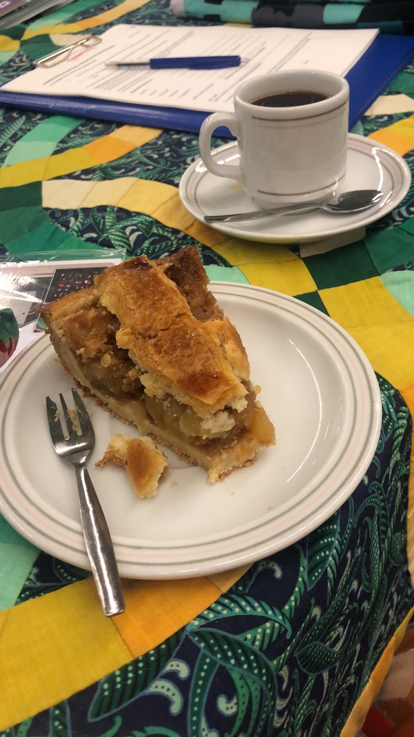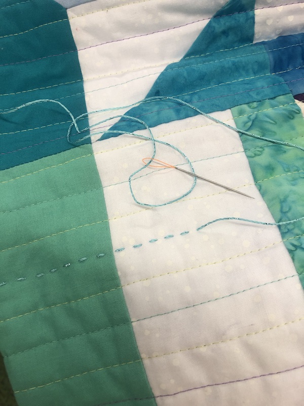 Een kopje koffie met appeltaart gehaald. En daarnaast moet je ook wat met je handen doen vind ik. Dus werkte ik aan mijn Moderne Round Robin die op de Algemene Tentoonstelling komt te hangen. Ik heb nieuwe naalden met een ‘lasso’. Die werken perfect voor big stitch met dikker garen. De naalden komen uit Duitsland. Kijk maar eens op de website www.lassonadel.de