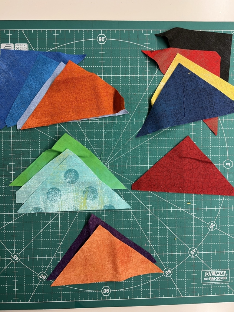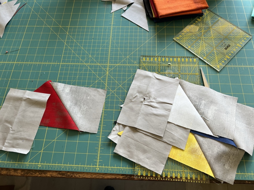 Dan gaan de raderen draaien in mijn hoofd. Het broeden op het thema begint en dan kijk ik eerst op Google bij afbeeldingen en daarna op Pinterest. Maar zoeken op 5 jaar is geen optie. Dus bedacht ik, om voor een bepaalde techniek te kiezen en daarmee verder te gaan werken. Door in quiltboeken te bladeren, kwam ik op het idee om Flying Geese te gaan maken. Dat zoekt in ieder geval makkelijker op Pinterest.