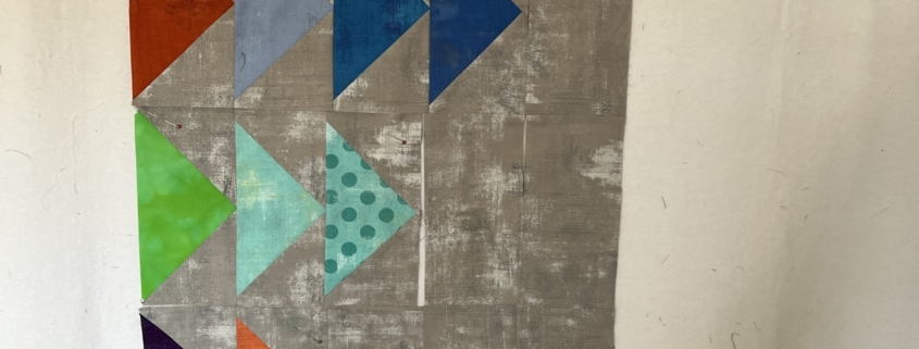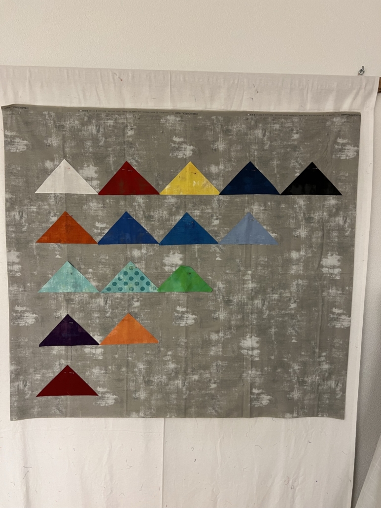 Mijn bedoeling was om 1 stofje te gebruiken uit het eerste jaar dat ik lid was van MeMo, 2 stofjes uit het tweede jaar enzovoort. Als eerste opzet heb ik op de designwand de grijze stof met daarop de driehoeken in de breedte vastgespeld. In deze optie vond ik de quilt veel te breed worden en ook werd hij zo korter dan de 1 meter die we met elkaar hadden afgesproken.
