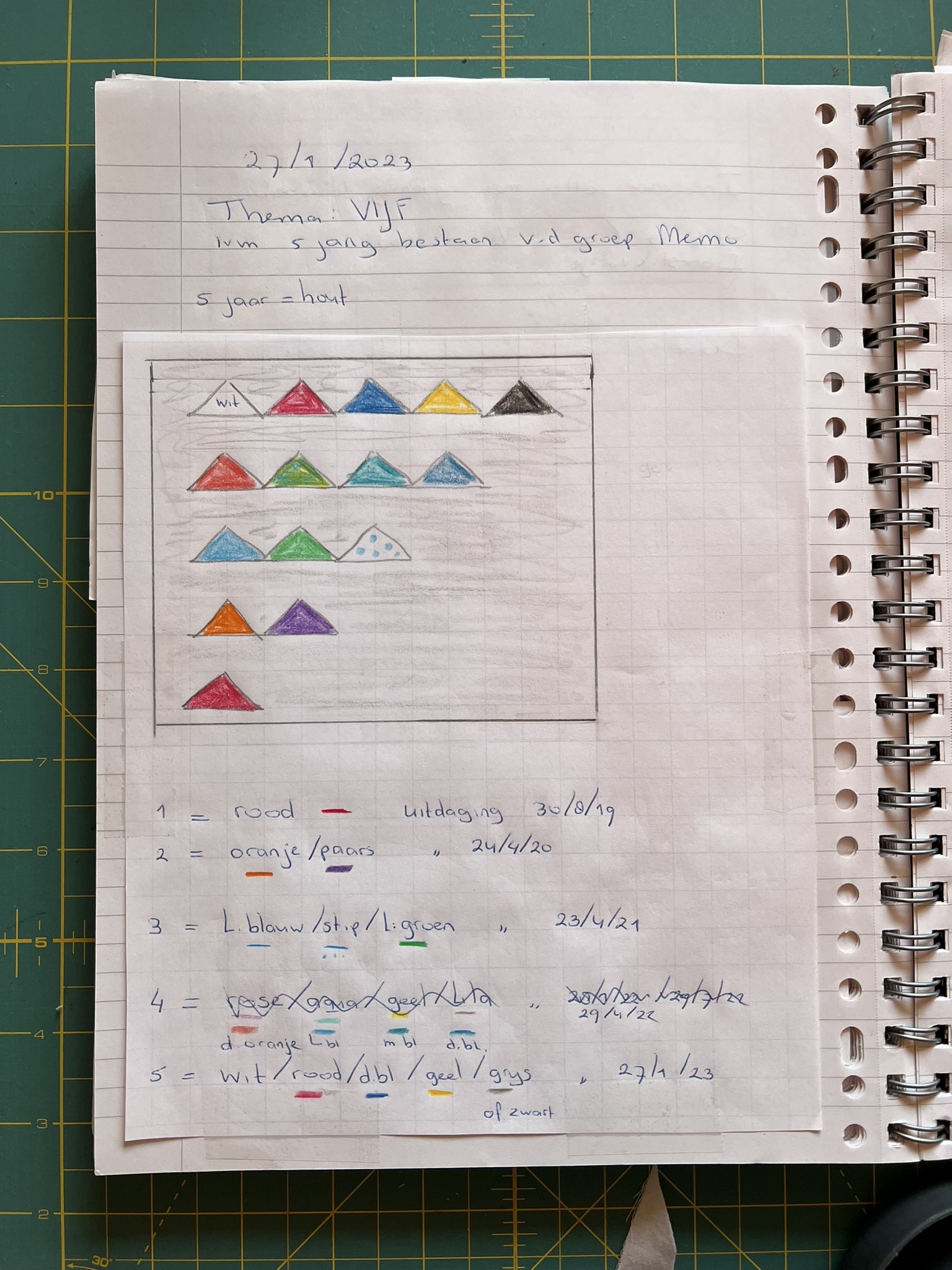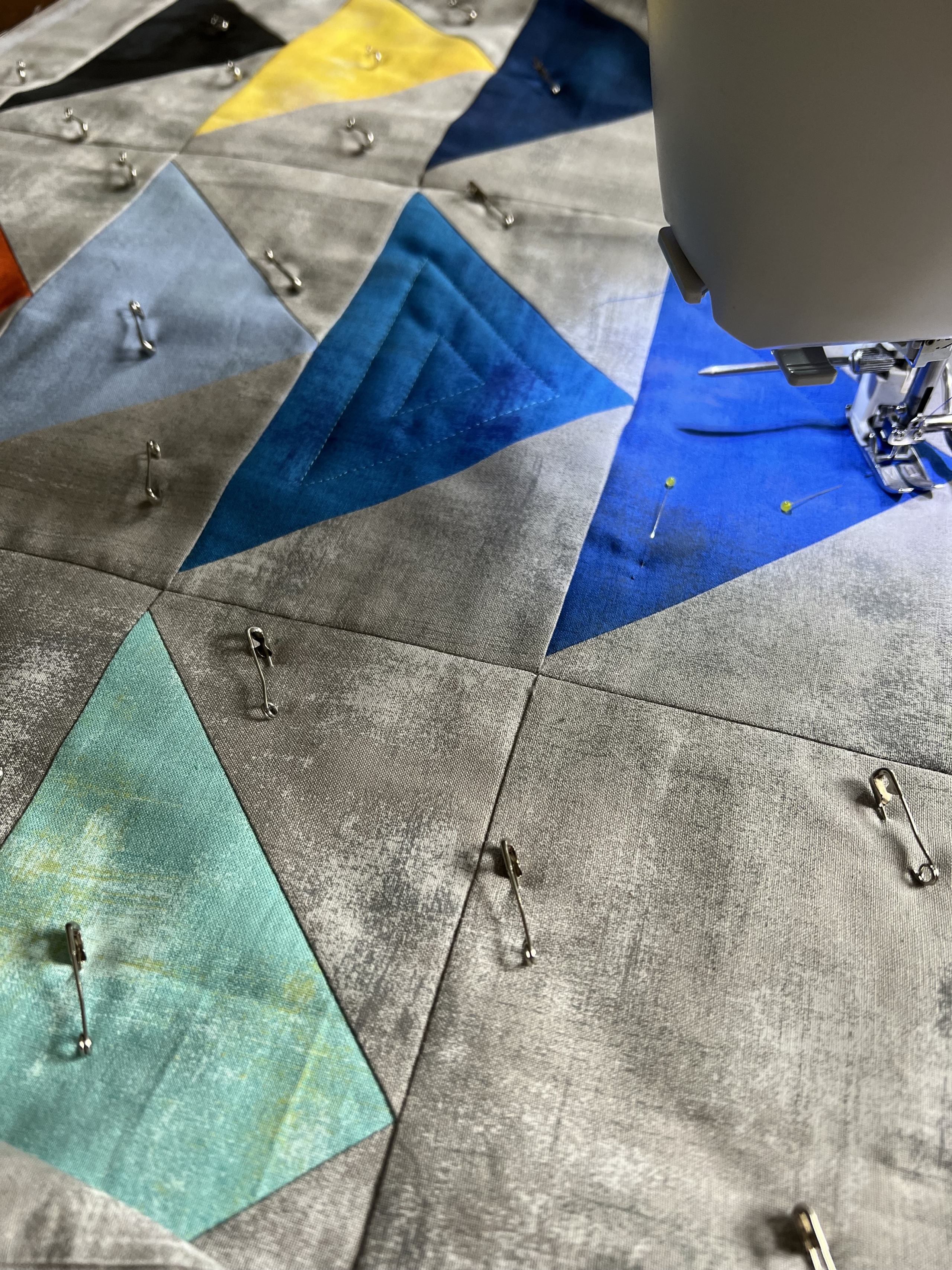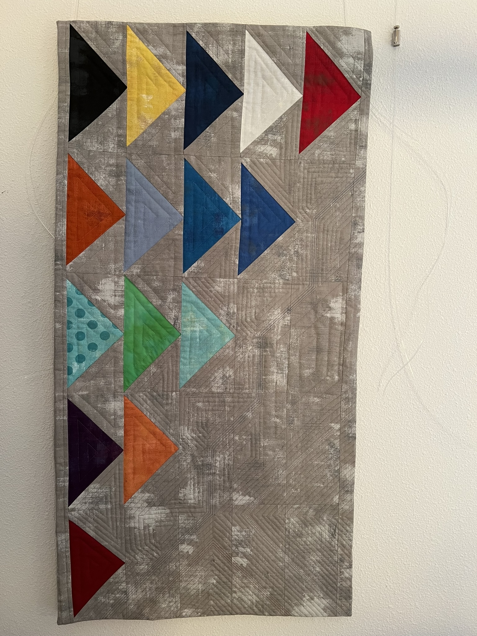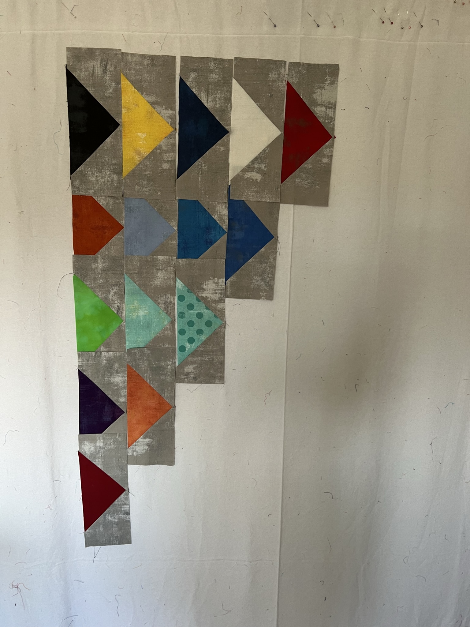 Mijn bedoeling was om 1 stofje te gebruiken uit het eerste jaar dat ik lid was van MeMo, 2 stofjes uit het tweede jaar enzovoort. Als eerste opzet heb ik op de designwand de grijze stof met daarop de driehoeken in de breedte vastgespeld. In deze optie vond ik de quilt veel te breed worden en ook werd hij zo korter dan de 1 meter die we met elkaar hadden afgesproken.
