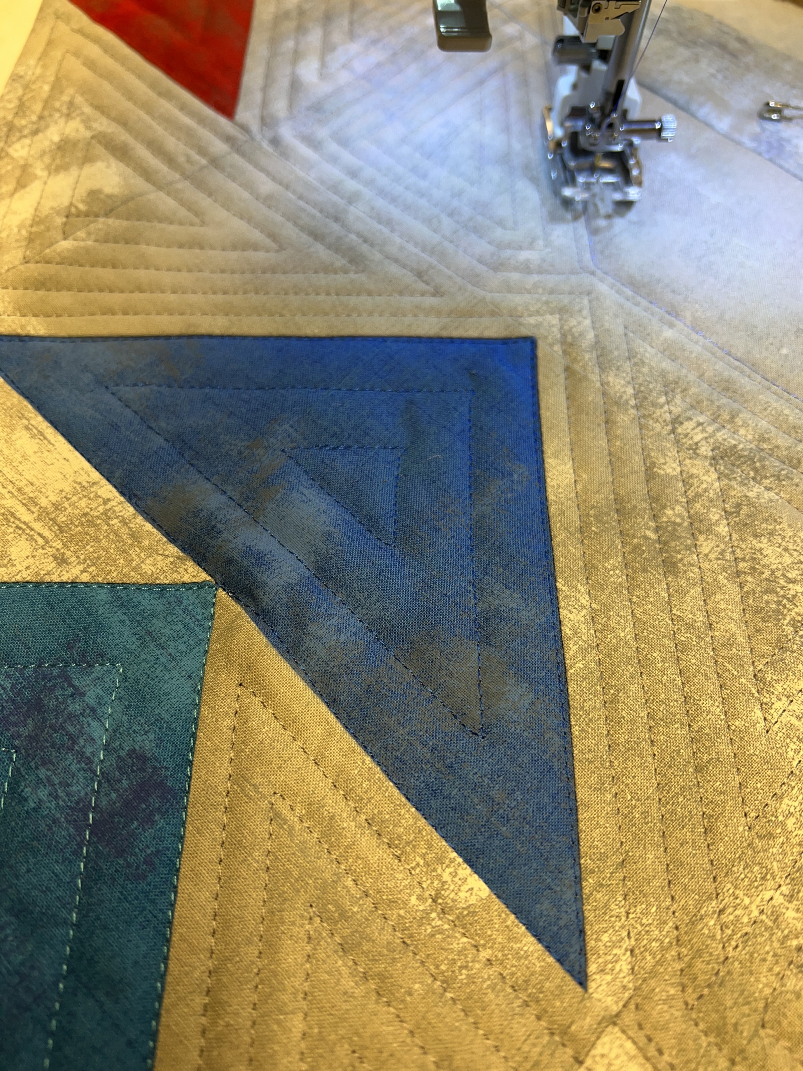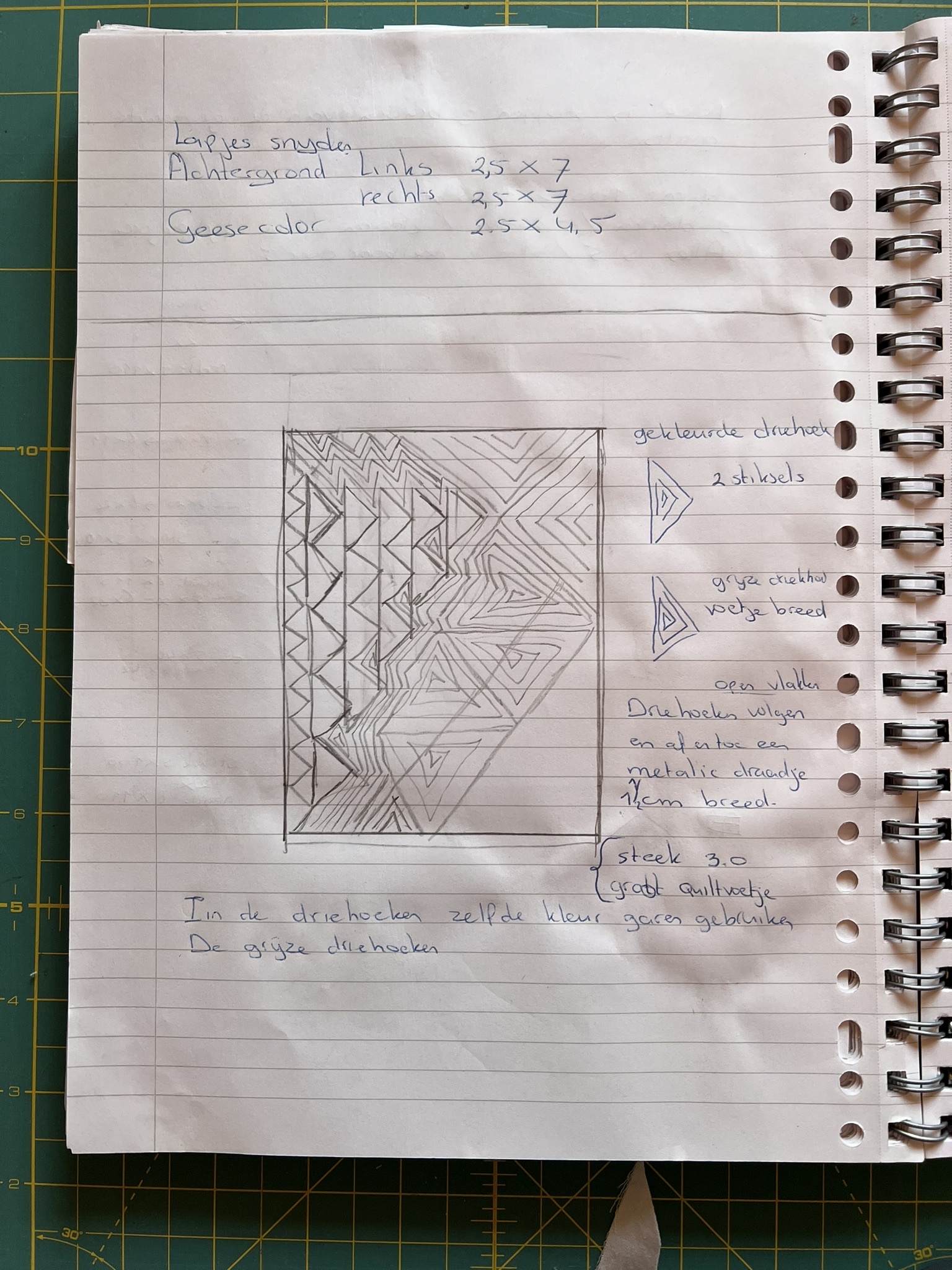 Dan gaan de raderen draaien in mijn hoofd. Het broeden op het thema begint en dan kijk ik eerst op Google bij afbeeldingen en daarna op Pinterest. Maar zoeken op 5 jaar is geen optie. Dus bedacht ik, om voor een bepaalde techniek te kiezen en daarmee verder te gaan werken. Door in quiltboeken te bladeren, kwam ik op het idee om Flying Geese te gaan maken. Dat zoekt in ieder geval makkelijker op Pinterest.
