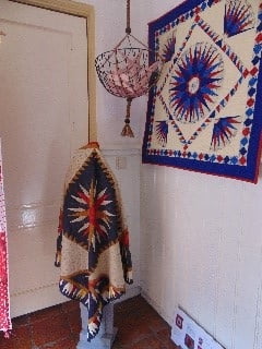 Het kompas is in het prachtige quiltpatroon Mariners Compass op heel persoonlijke manier te verwerken in eigen kleurstellingen. De helder blauwe Mariners Compass Quilt van Gerdy Nijland siert, heel passend, op Aruba de wand van een werkkamer.