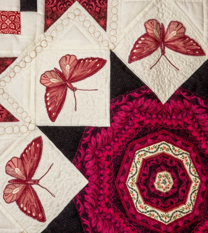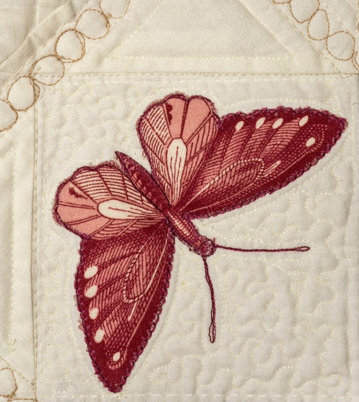 Zo ook Jan van Roest die zijn quilt net af had toen het bericht doorkwam dat de tentoonstelling in Nijkerk afgelast werd vanwege corona. Zijn quilt siert nu de cover van Quiltnieuws 147 met vrolijke vlinders.