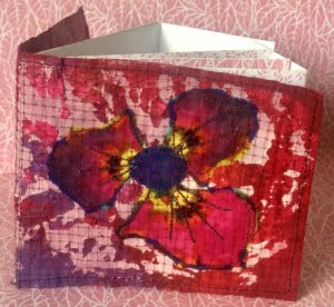 Marian Meijerink houdt ervan om nieuwe dingen uit te proberen en te werken met materiaal dat voorhanden is. De mooie lijntjes in een gecraqueleerd voorwerp trokken haar aandacht en ze besloot te kijken hoe ze dat met stof kon bereiken. Ze vertelt: “Tijdens het craqueleren had ik een lapje waarop helemaal geen barstjes te zien waren. Dus geen verf opgenomen via de scheurtjes in het opgedroogde meelpapje. Overal heb ik wat stukjes verf verwijderd en ook juist laten zitten. Dubbelgevouwen voor een omslag van een boekje, op de voorkant een bloem genaaid. Om te voorkomen dat er meer stukjes verf af zouden gaan heb ik er ook gaas overheen genaaid. Bladzijden erin en met de naaimachine op de middellijn vastgezet met een rechte steek”.