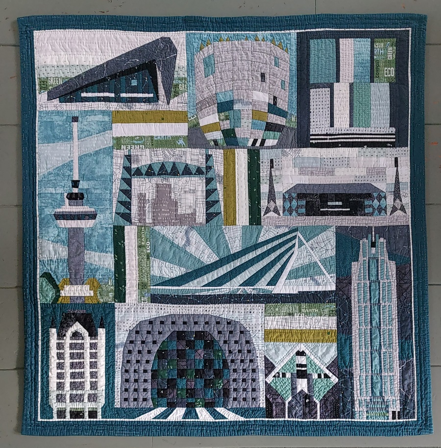 Op de cover een quilt van Rita Dijkstra, Mountains of memories. Als je de quilt ziet, heb je direct zin om op vakantie te gaan naar de bergen. En Dorette Ghajar heeft zelf een quilt ontworpen over haar stad Rotterdam. Alle eye-catchers van Rotterdam zijn erop te zien zoals de Euromast, de Erasmusbrug en de Markthal. In ‘Het verhaal achter de quilt’ vertelt ze over de totstandkoming ervan.