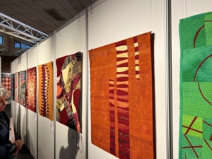 Deze dag leerde ik wat een Bobbin was, want ook die hingen ergens en een paar van het groepje waar ik mee liep hadden er ook een gemaakt. Wij natuurlijk zoeken in die hal, maar wat wij ook zochten nergens waren hun Bobbins te vinden. Wat bleek bij navraag, dat er 140 Bobbins niet waren uitgepakt! In Rijswijk op Patchwork- en Quiltdagen zullen ze wel allemaal te zien zijn.