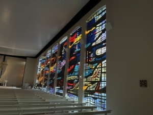 Op de terugweg nog een kerkje met prachtig gebrandschilderde ramen bekeken. Bij terugkomst stonden er heel veel Porsches uit Engeland op de P-plaats van het hotel. Een mooi gezicht, maar wel wat lastiger voor onze chauffeur om achteruit te rijden om ons af te zetten. Ook deze avond weer heerlijk gegeten.