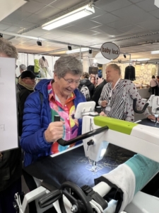 En toen nog shoppen op de ‘huishoudbeurs’ voor de quilters. Ik miste wel de grote boodschappen trolleys 😊, die je altijd ziet op de echte Huishoudbeurs. Sommige dames hadden heuse boodschappenlijstjes. De een zal geslaagd zijn en de ander niet. Zelf mocht ik bij een stand een heuse longarm quiltmachine proberen. Ik heb die man nog gewaarschuwd dat ik wel kon autorijden ( het leek net een soort stuur), maar dat ik van quilten geen kaas gegeten had. Was niet erg, zei hij. Ik denk dat hij er achteraf wel spijt van heeft gehad, want ik ‘scheurde’ zo over allerlei prachtige patronen van anderen heen.