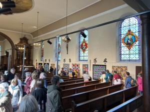 Herman liet ons zien waar wij ’s-middags weer moesten opstappen. Door Herman werd de deur voor mij geopend met de mededeling : “Haal jij de tickets en programma boekjes even?”. Geen idee waar, maar stoer liep ik de bus uit en ging op zoek. Ergens helemaal achteraan vond ik de ticket office. Weer terug in de bus alles uitgedeeld en de eerste dames stapten uit de bus. Veel reden mee naar de volgende plaatsen. Zelf stapte ik uit in Rombach. Gelukkig mocht ik mee met het groepje van Jannie, anders had ik mij geen raad geweten in deze bijzondere wereld van quilters.