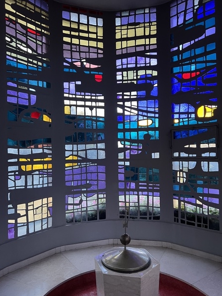 Op de terugweg nog een kerkje met prachtig gebrandschilderde ramen bekeken. Bij terugkomst stonden er heel veel Porsches uit Engeland op de P-plaats van het hotel. Een mooi gezicht, maar wel wat lastiger voor onze chauffeur om achteruit te rijden om ons af te zetten. Ook deze avond weer heerlijk gegeten.