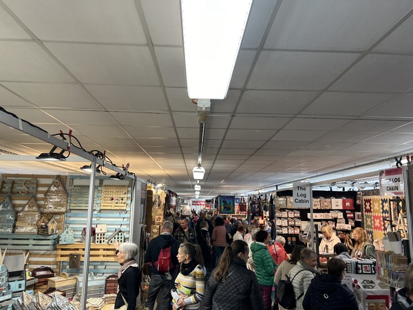 En toen nog shoppen op de ‘huishoudbeurs’ voor de quilters. Ik miste wel de grote boodschappen trolleys 😊, die je altijd ziet op de echte Huishoudbeurs. Sommige dames hadden heuse boodschappenlijstjes. De een zal geslaagd zijn en de ander niet. Zelf mocht ik bij een stand een heuse longarm quiltmachine proberen. Ik heb die man nog gewaarschuwd dat ik wel kon autorijden ( het leek net een soort stuur), maar dat ik van quilten geen kaas gegeten had. Was niet erg, zei hij. Ik denk dat hij er achteraf wel spijt van heeft gehad, want ik ‘scheurde’ zo over allerlei prachtige patronen van anderen heen.