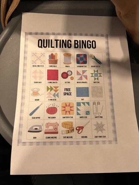 Om de dames toch nog even bezig te houden, hebben we een Bingo in de bus gedaan. Uiteraard aangepast aan het gezelschap. Volgens mij een geslaagde actie gezien de reacties. O ja, die leuke stukjes van het internet over quilten brachten ook lachsalvo’s in de bus teweeg, dus niet voor niets meegenomen.