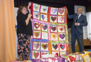 Vooraf hadden we contact met de gemeente Valkenburg in de persoon van Bianca Rooding, om te vragen of de burgemeester van Valkenburg de quilts in ontvangst wilde nemen. Ze legde dat voor aan hem voor en gelukkig reageerde hij positief. Op het toneel, goed zichtbaar voor alle aanwezigen, nam Daan Prevoo [die dankzij een handwerkende moeder niet geheel onvoorbereid was] de quilts symbolisch in ontvangst. De afspraak is gemaakt om 13 juli, als het een jaar geleden is dat Valkenburg getroffen werd door het overtollige water uit de Geul, de quilts ook aan de mensen te overhandigen. Dat geeft ons mooi de tijd om van de blokken die er nog liggen ook nog quilts te maken en enkele tops nog door te quilten. Mocht je daarbij willen helpen dan horen wij dat graag via pr@quiltersgilde.nl