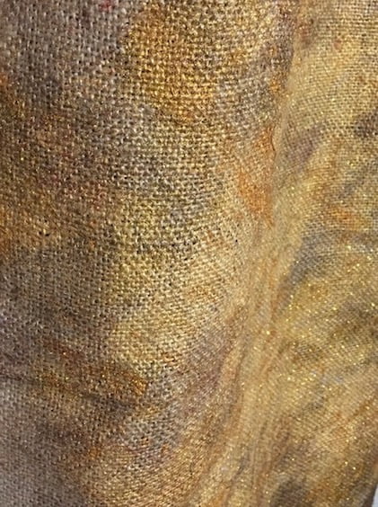 Ondanks alles is het werken aan mijn textiele projecten voor de aanstaande festivals een fantastische afleiding. Gisteren heb ik voor het Quiltfestival in Noord Groningen de laatste jute zak geverfd in vooral goud tinten. Het is altijd even afwachten of dat wat ik in gedachten heb ook daadwerkelijk lukt, maar ik ben heel tevreden met het resultaat. Nu ga ik verder met het bewerken van de zak in zwart tinten en glitter borduursteken. De inspiratie is de lichtvervuiling. Nergens zijn de nachten nog echt donker. Wij zien nog wat sterren, maar de duisternis wordt overstemd door al het kunstmatige licht. In het project Verhalend Landschap vind ik dit een mooie toepasselijke invulling voor het vertolken van de maand december.