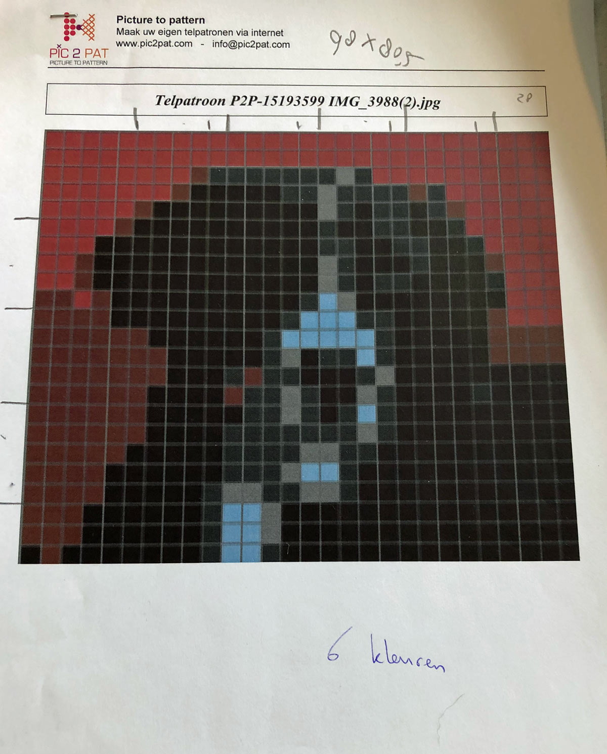 Deze website wekt mijn interesse en ik ben gaan spelen met foto’s om deze om te zetten in een borduurpatroon. Het programma geeft veel mogelijkheden aan kleuren. Je kunt kiezen uit de originele kleuren, maar ook kiezen voor 20 of 10 of 6 of 2 kleuren. Wat is dit leuk om te doen. De gok gewaagd en een leuke foto van de hond van mijn dochter omgezet in het borduurpatroon. Ik heb gekozen voor 6 kleuren. Uiteindelijke gebruik ik de hondenkop om een pixelquilt te maken.