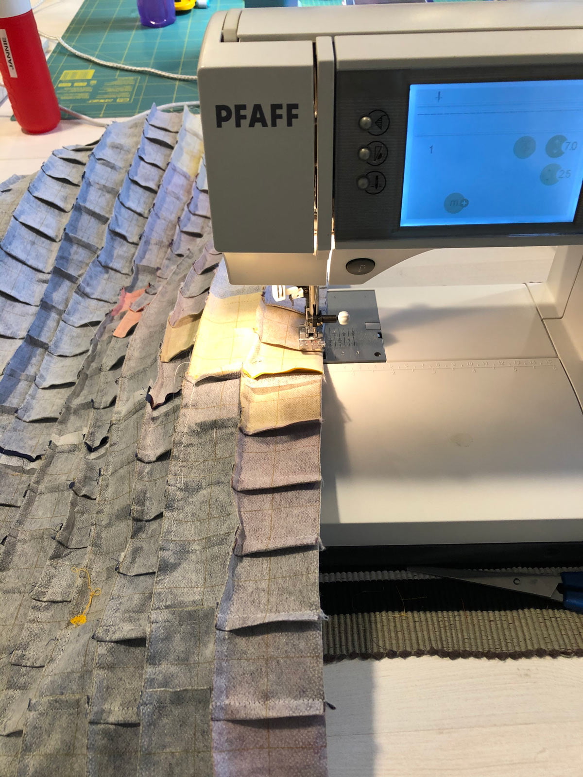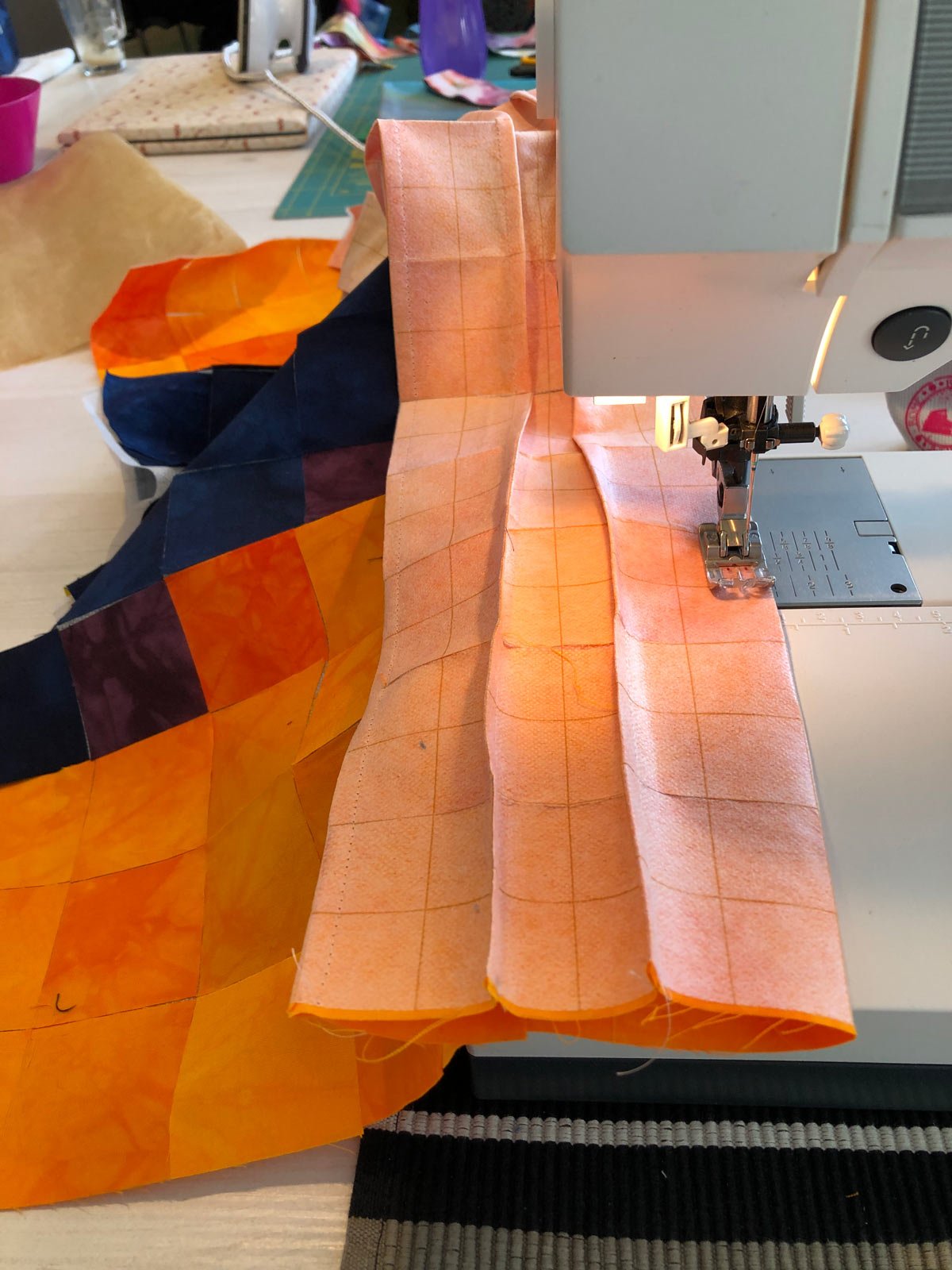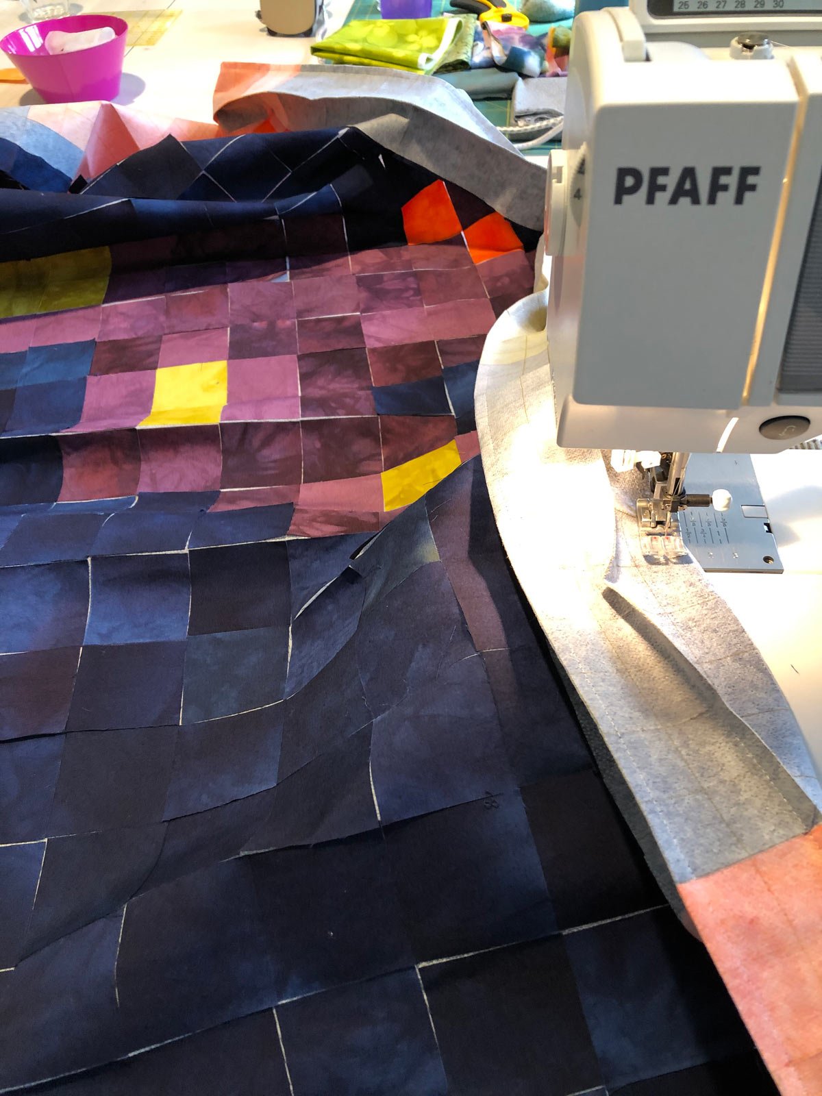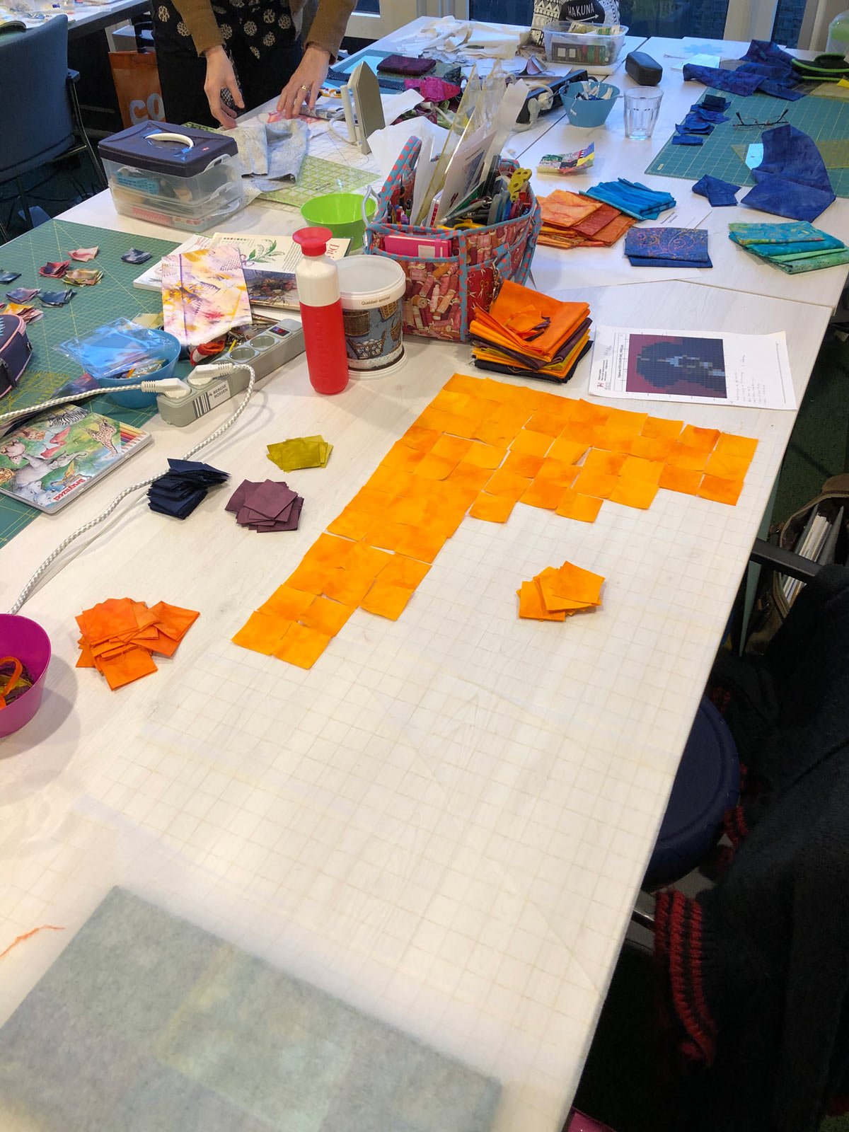 Met mijn eigen geverfde stoffen ben ik aan het werk gegaan. Van de juffen kregen we een pakje Quiltgrid. Dit is een soort vlieseline die in inch blokjes is ingedeeld. Mijn keus viel op 2 inch dus een vierkantje van 2×2 blokjes gebruiken. Eerst de kleuren bij elkaar zoeken en dan de blokjes gaan snijden. De blokjes op het Quiltgrid leggen, het is net puzzelen. Eigenlijk borduren met vierkantjes stof. In ons lokaal is het af en toe ook muisstil. Je hoort deelnemers ook in zichzelf praten en tellen. Iedereen is geconcentreerd bezig.