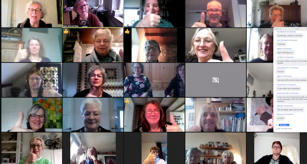 Zoom is een uitkomst. Leuk om jullie ( bijna) allemaal bij elkaar te zien. En op de achtergrond veel mooie quilts. Fijn dat jullie nog steeds voor ons, leden, bezig zijn.