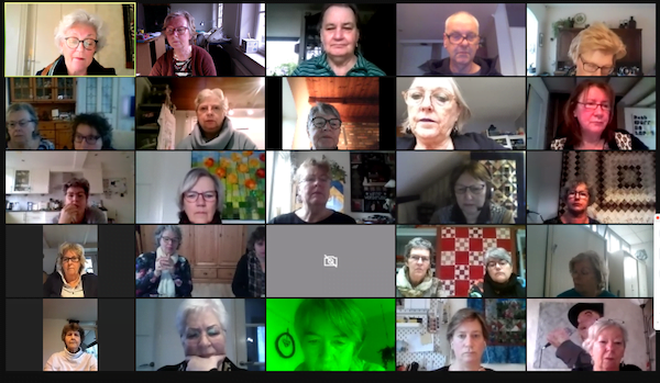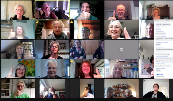 Zoom is een uitkomst. Leuk om jullie ( bijna) allemaal bij elkaar te zien. En op de achtergrond veel mooie quilts. Fijn dat jullie nog steeds voor ons, leden, bezig zijn.