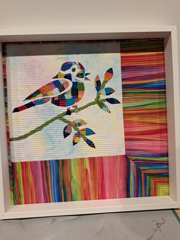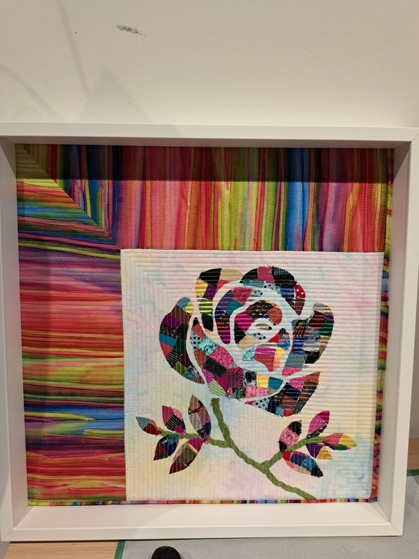 We kunnen kiezen uit een afbeelding van een roos of van een vogel. Vervolgens teken je de onderdelen op Steam-a-Seam en dan plak je kleine stukjes stof op de Steam-a-seam. Alle onderdelen uitknippen en op een mooie ondergrondstof plakken. Door alle verschillende pakketjes is het verrassend hoe alle rozen en vogels anders zijn.
