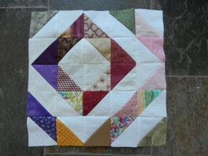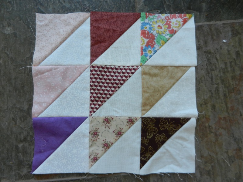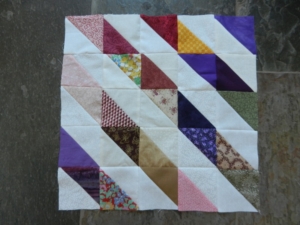Maar terug naar de HST’s. Bij elk gekleurd vierkantje snijd ik ook een wit vierkantje, van diverse witte lappen. Niet alleen verschillend van motiefje, maar ook verschillend in witheid. Ik leg een wit lapje op een gekleurd lapje, teken een diagonaal op het witte lapje en naai aan beide zijden van die lijn een naadtoeslag. Ik snijd de aan elkaar genaaide vierkantjes door over de getekende lijn, vouw ze open en voilà, een vierkant bestaande uit een witte driehoek en een gekleurde driehoek. (Als je nu denkt, waar heb je het allemaal over, zou het handig kunnen zijn om je te verdiepen in HST’s, bijvoorbeeld bij één van mijn eerdere blogs over HST’s. Natuurlijk is er op internet en in boeken nog veel meer informatie over HST’s te vinden.