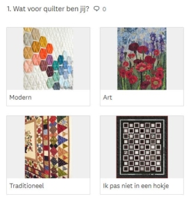 Op de vraag welke type quilter men is, gaf bijna de helft van de leden (48%) aan dat zij zichzelf beschouwen als traditionele quilter. Iets meer dan een derde (38%) vindt dat zij niet in een specifiek quilt hokje passen. Bijna 8% van de leden noemt zich een moderne quilter. De resterende 7% beschouwt zichzelf als een art quilter.
