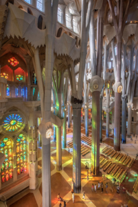 Eén gegeven wil ik belichten, want voor Antoni Gaudi was de natuur een inspiratiebron. De pilaren die binnen de dakconstructie dragen, zijn verschillend van dikte en kleur (marmer, zandsteen en basalt), zoals in een bos ook geen boom hetzelfde is. Verder naar boven vertakken zich de pilaren gelijk aan een boom. Zelfs zijn er op hoogte lampen ingebouwd, die suggereren, dat het afgezaagde takken zijn. Ik was zeer onder de indruk, wat deze man, voor mij een genie, geproduceerd heeft. Met goedkeuring van zijn opdrachtgever is hij begraven in de basiliek.
